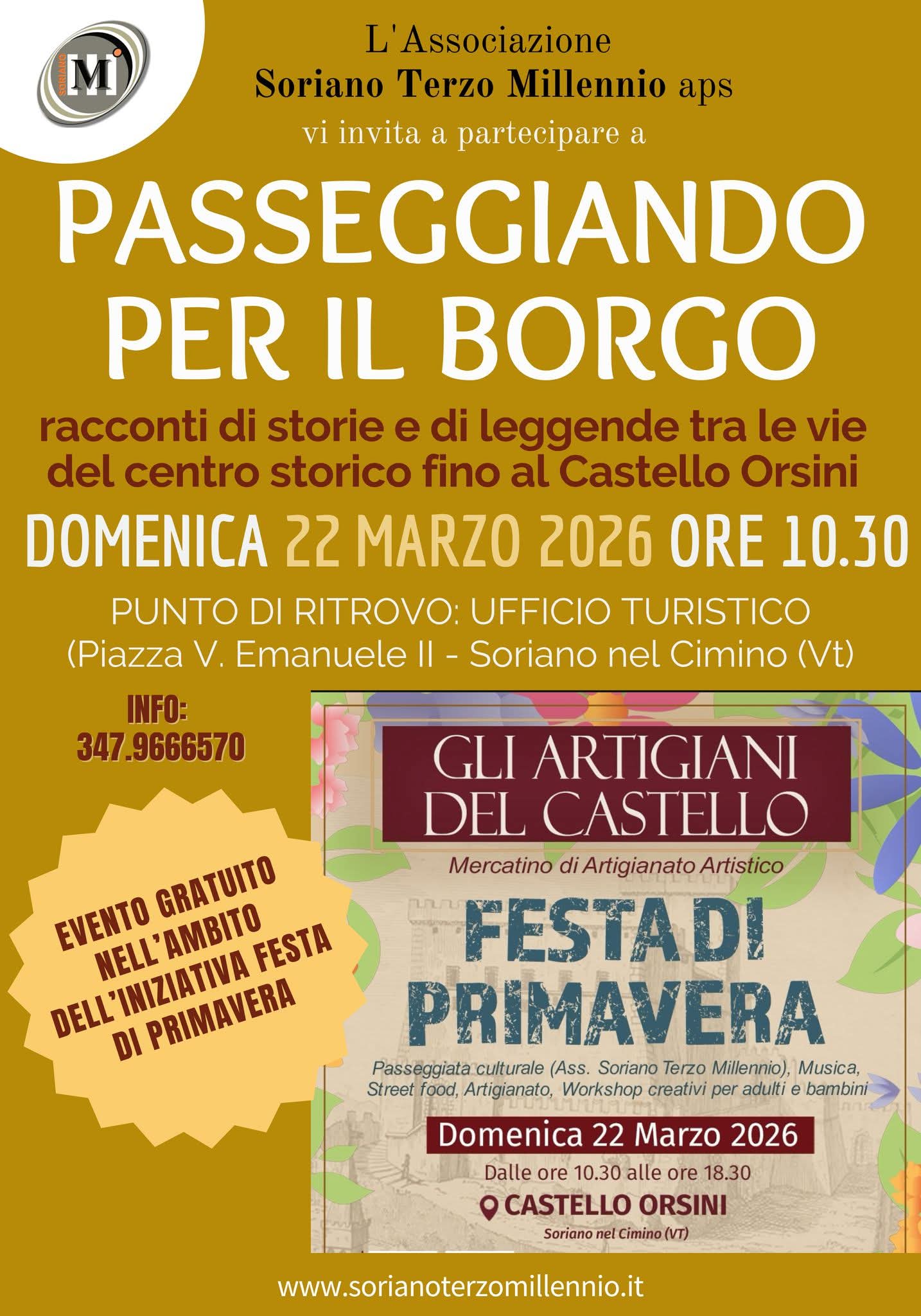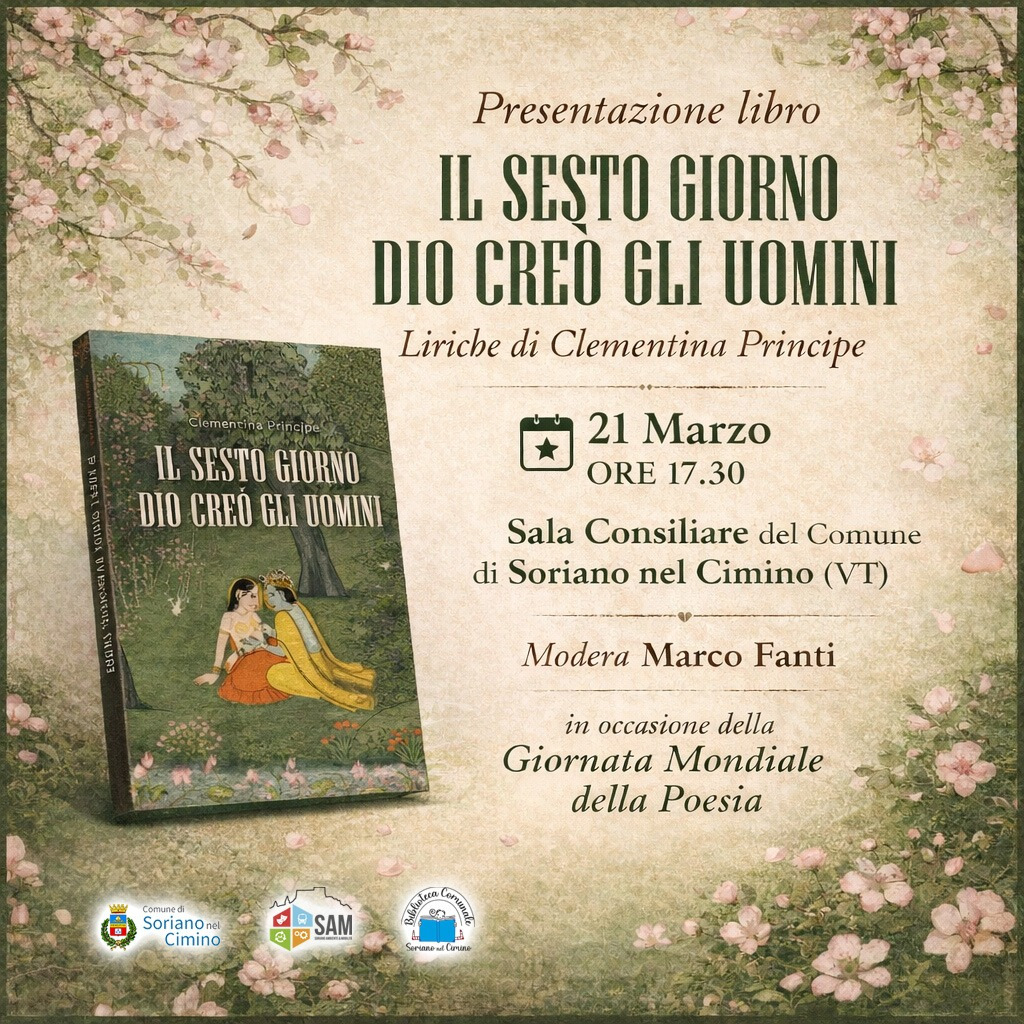 | 0 eventi, | 0 eventi, | 0 eventi, | 0 eventi, | 0 eventi, | 1 evento, ![]() In occasione della Giornata Mondiale della Poesia, sabato 21 marzo 2026 si terrà a Soriano nel Cimino la presentazione del libro “Il Sesto Giorno Dio Creò gli Uomini”, raccolta di liriche della poetessa Clementina Principe. L’evento rappresenta un importante appuntamento culturale dedicato alla poesia contemporanea. A moderare l'incontro sarà Marco Fanti, che guiderà il dialogo […] | 3 eventi, ![]() Domenica 22 marzo 2026 alle ore 10:30 torna a Soriano nel Cimino l'iniziativa culturale “Passeggiando per il Borgo”, una suggestiva passeggiata tra le vie del centro storico alla scoperta di storie, tradizioni e leggende locali. L’evento, organizzato dall’associazione Soriano Terzo Millennio APS, accompagnerà i partecipanti in un viaggio nel tempo tra vicoli, piazze e antichi […] ![]() Il Comune di Soriano nel Cimino, in collaborazione con la Banda Musicale di Soriano nel Cimino e il Conservatorio Statale di Musica “G. Briccialdi” di Terni, presenta un appuntamento musicale imperdibile: il concerto della Briccialdi Saxorchestra, in programma domenica 22 marzo 2026 alle ore 18:00 presso la Chiesa di Sant’Eutizio M. Programma musicale: dai classici […] - ![]() Festa di Primavera a Soriano nel Cimino: artigianato, musica e street food Domenica 22 marzo 2026, il suggestivo Castello Orsini di Soriano nel Cimino ospiterà la Festa di Primavera, un evento dedicato all’artigianato, alla cultura e alle tradizioni locali. Protagonista della giornata sarà il mercatino artistico “Gli Artigiani del Castello”, che riunirà creativi, artigiani e […] |