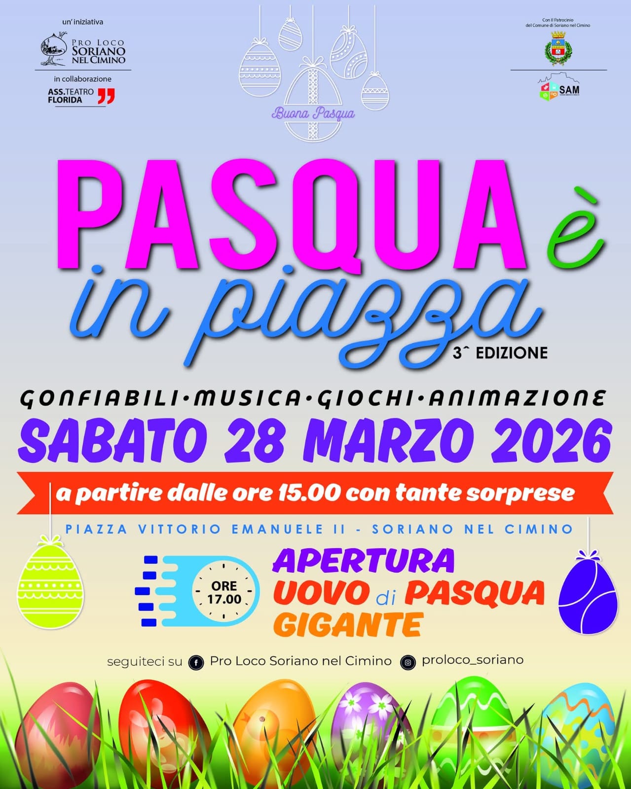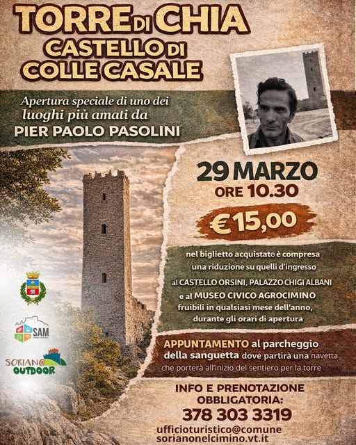| 0 eventi, | 0 eventi, | 0 eventi, | 0 eventi, | 0 eventi, | 1 evento, ![]() Soriano nel Cimino si prepara a celebrare la Pasqua con un evento speciale dedicato a grandi e piccoli. Sabato 28 marzo 2026, torna “Pasqua in Piazza”, giunta alla sua terza edizione, un appuntamento ormai atteso che anima il centro del paese con giochi, musica e intrattenimento. Un pomeriggio di festa nel cuore di Soriano nel […] | 1 evento, ![]() Un’occasione unica per scoprire la Torre di Chia – Castello di Colle Casale, uno dei luoghi più amati da Pier Paolo Pasolini. 29 Marzo – 10:30 €15,00 Parcheggio e appuntamento navetta: https://maps.app.goo.gl/P4X3J1dckPoK1VaR9 Prenotazione obbligatoria: 378 303 3319 𝐒𝐭𝐨𝐫𝐢𝐚, 𝐧𝐚𝐭𝐮𝐫𝐚 𝐞 𝐛𝐞𝐥𝐥𝐞𝐳𝐳𝐚 𝐢𝐧 𝐮𝐧’𝐮𝐧𝐢𝐜𝐚 𝐞𝐬𝐩𝐞𝐫𝐢𝐞𝐧𝐳𝐚. |